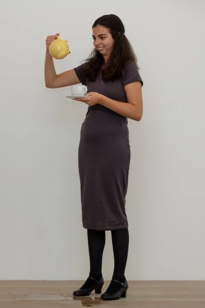 Woman with Salad was first exhibited in Berlin in 2016 and has continued to be developed by Perry. It is a work for a lone or group of female performers who each concurrently enact a gesture, repeated continuously for an hour. The endless looping format of the GIF, from which Perry has sourced the movements enacted by the performer, echo the repetitive actions of female labour. These GIFs have been taken from stock image libraries, the performer mimicking the reductive images designed to be distributed and consumed by patriarchal capitalism.